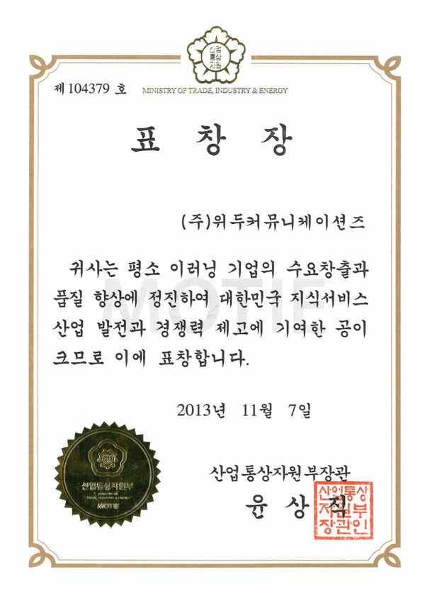 이러닝 기업의 수요 창출과 품질 향상 페이지 정보 작성자 WeDu 댓글 0건 조회 5,806회 작성일 19-05-30 19:32 본문 2013-11-07 표창장 제 104379호 이러닝 기업의 수요 창출과 품질 향상 산업통상자원부장관 윤상직 List Previous한국여성벤처협회 표창장 19.05.30 Next이러닝 콘텐츠 품질 인증 우수 심사 19.05.30
