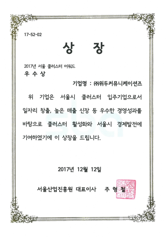 서울클러스터 어워드 우수상 페이지 정보 작성자 WeDu 댓글 0건 조회 6,892회 작성일 19-05-30 19:34 본문 2017-12-12 우수상 17-52-02 서울클러스터 어워드 서울산업진흥원 대표이사 주형철 List Previous서울특별시장 표창장 19.05.30 Next산업통상자원부 표창장 19.05.30