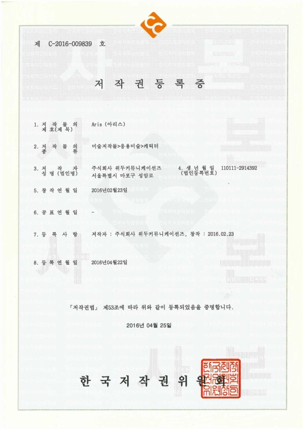 [한국/저작권] 아리스 페이지 정보 작성자 WeDu 댓글 0건 조회 6,205회 작성일 19-05-30 19:09 본문 2016-04-22 저작권 C-2016-009839 아리스 / 미술저작물>응용미술>캐릭터 List Previous[한국/저작권] 필립 19.05.30 Next[한국/저작권] 리안 19.05.30